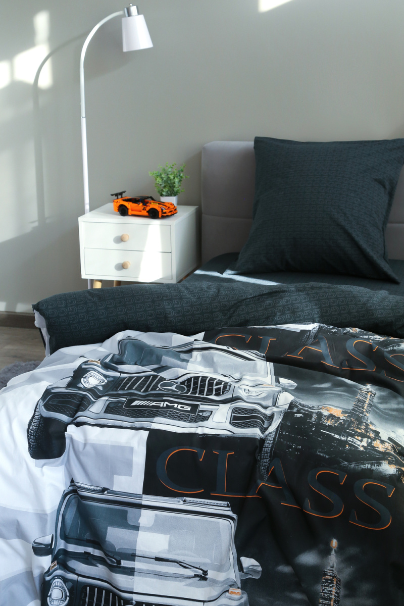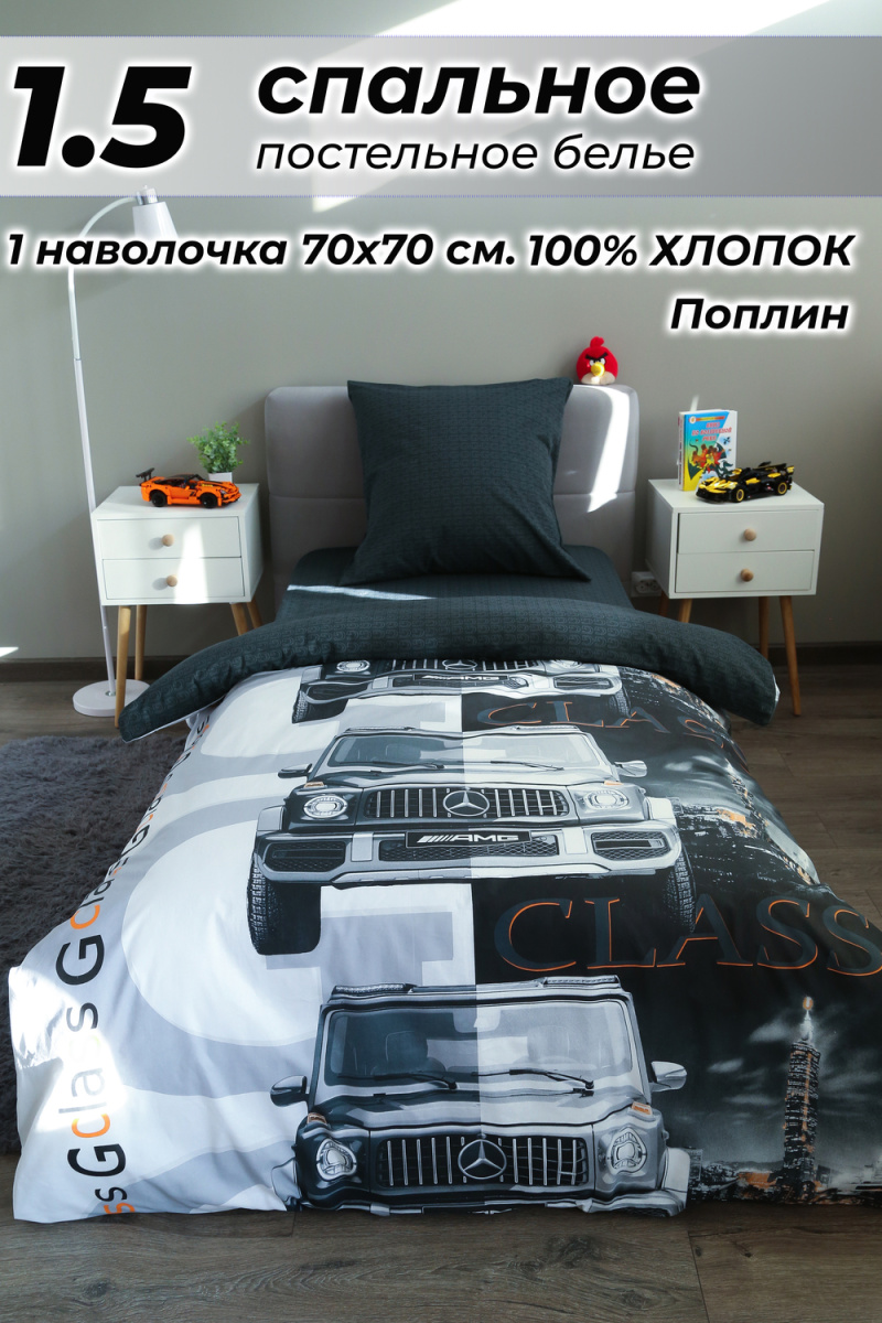 Детское постельное белье 1,5 спальное черное с рисунком автомобиля гелентваген мерседес в сером фоне из ткани поплин на 1.5 спальную кровать. Стильный дизайн гелентваген машинка понравится мальчишкам и подарит яркие мечты и сны. Постельное белье из натуральной ткани плотности 115 гр/м2, состоящий из 100% хлопка, абсолютно экологичен, не вызывает аллергии, хорошо пропускает воздух, позволяя телу дышать. При правильном уходе постельное белье 1.5 спальное с машиной прослужит вам долгое время. Предварительная стирка обязательна. Перед стиркой вывернуть изделие на изнаночную сторону. Стирать отдельно от синтетических изделий. Машинная стирка при максимальной температуре 40С, мягкий режим. Постельное белье детское 1,5 спальное с машинками стирать моющими средствами для цветных тканей. Не отбеливать. Гладить с изнаночной стороны при максимальной температуре утюга. Усадка после стирки до 3%, от заявленных размеров изделия. Ткань не подвержена образованию катышков.
