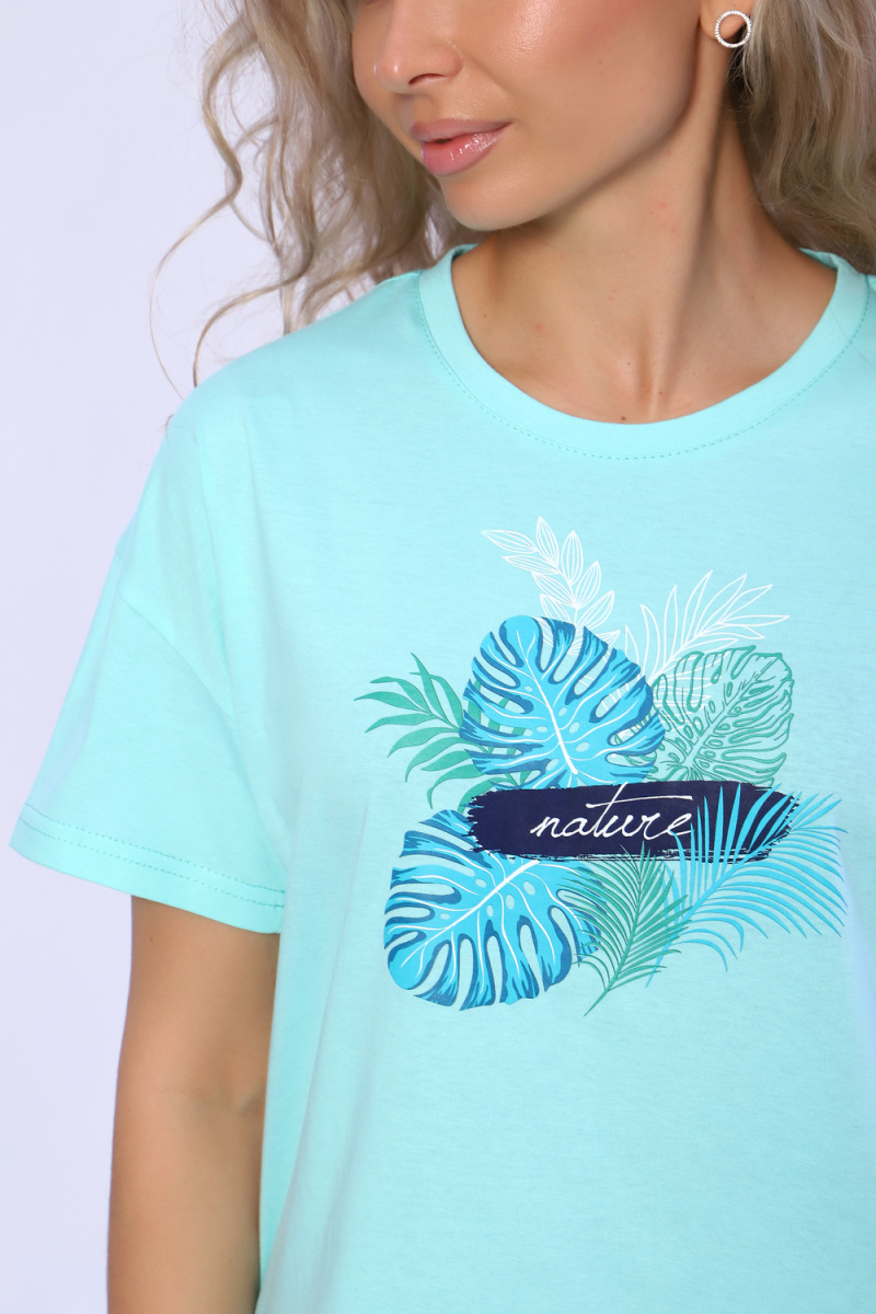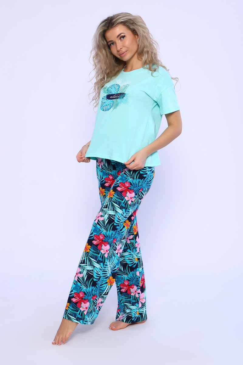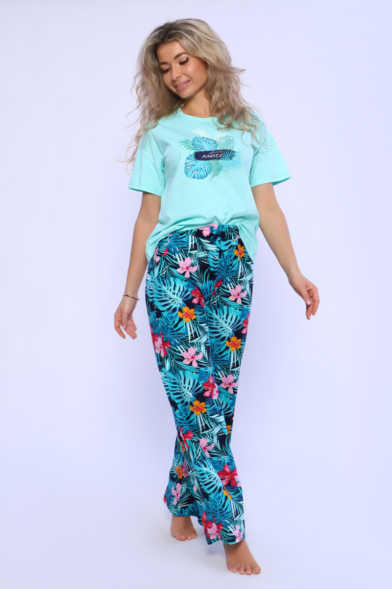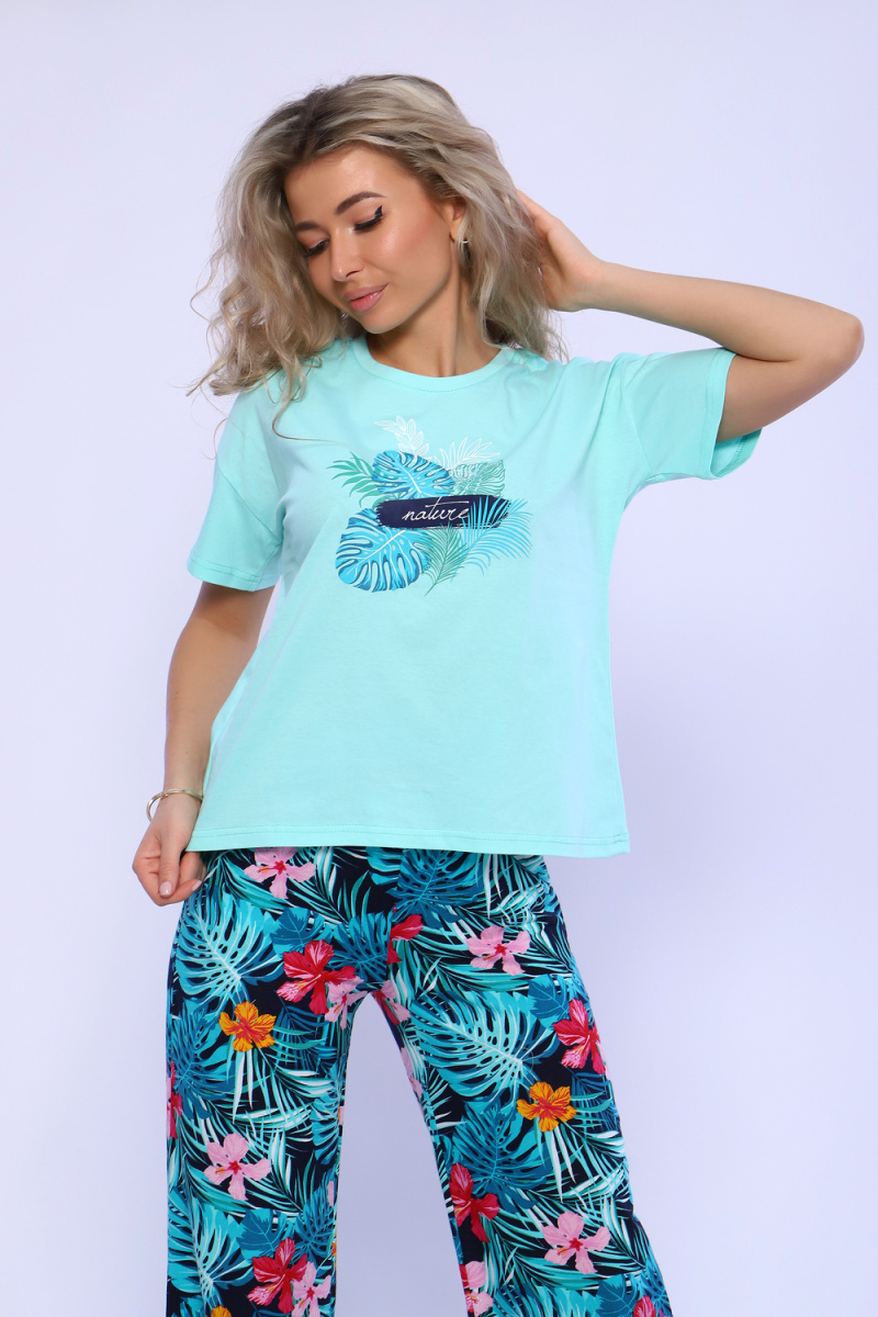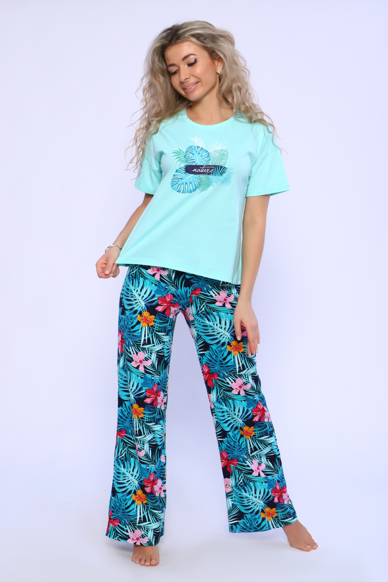 Женский домашний костюм - пижама, состоящий из футболки и брюк Листья из трикотажного полотна 100%-го хлопка. Приятный дышащий материал идеален для изготовления домашней одежды. Футболка свободного кроя, с круглой горловиной и втачным спущенным коротким рукавом, в которой будет одинаково приятно спать и заниматься домашними делами. Оригинальный, яркий принт обязательно поднимет настроение. Брюки прямого силуэта свободного кроя, с карманами в боковых швах. Мягкий удобный пояс на резинке не перекрутится, т.к отстрочен на поясной машине. Пижамка не изменит свой внешний вид после стирки при соблюдении рекомендаций по уходу и будет долго вас радовать. Обязательно возьмите этот костюм в отпуск. Отличный подарок для всех девушек и женщин на любой праздник!